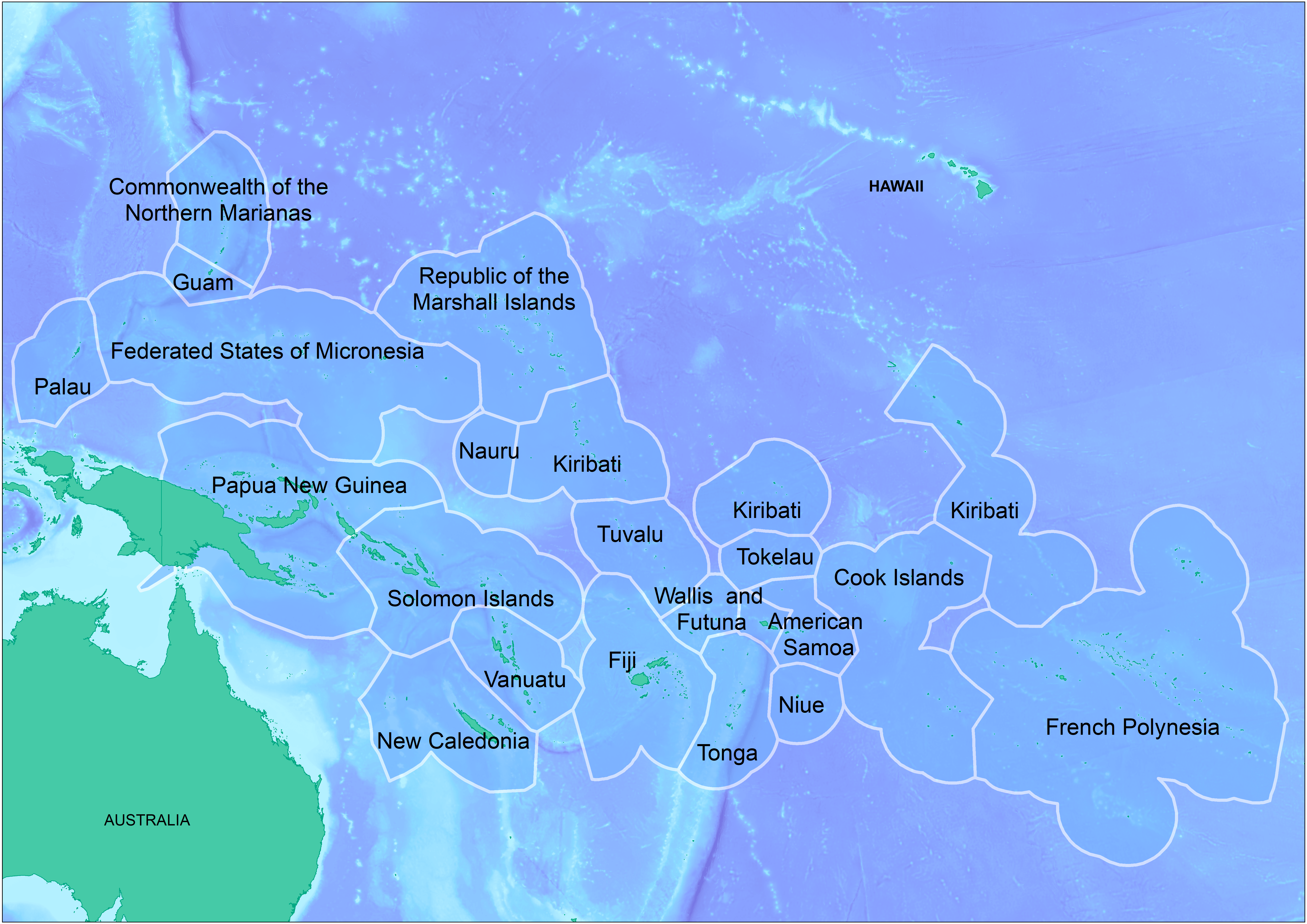 The map is high resolution showing SPREP member countries' Exclusive Economic Zone (EEZ) boundaries overlaid on a bathymetric base layer that was developed by the GIS team at SPREP.